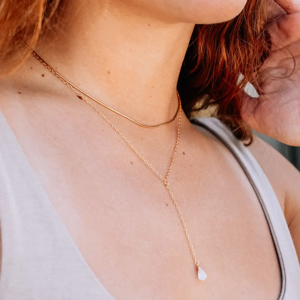 The Moonstone Lariat Necklace is a piece that moves with light and energy. A luminous moonstone drop hangs from a fine golden chain, catching subtle flashes of color with every movement. Designed to mirror the phases of the moon and the cycles of change, it carries both beauty and meaning.